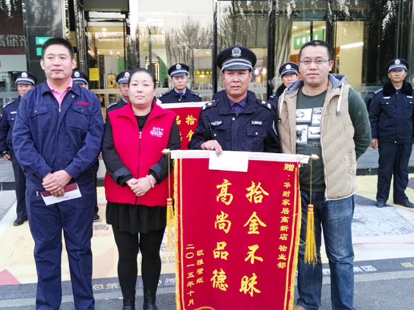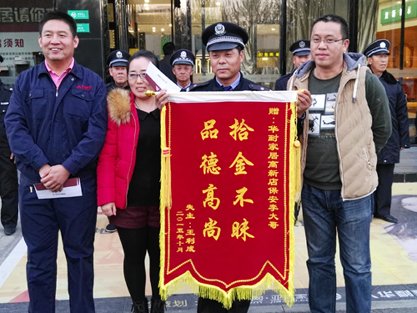 2015102318是許,保安李明寶在當(dāng)日營業(yè)結(jié)束清場(chǎng)檢查時(shí),在張家口華耐高新店商場(chǎng)南區(qū)3層衛(wèi)生間撿到1只皮挎包,立即教到物業(yè)部值班室,經(jīng)值班人員共同檢查,內(nèi)有包括汽車鑰匙、多張信用卡、駕駛證等物品。19時(shí)30分,失主前來尋找。次日上午,為感謝李明寶,失主專程送來“拾金不昧,品德高尚”錦旗一面。